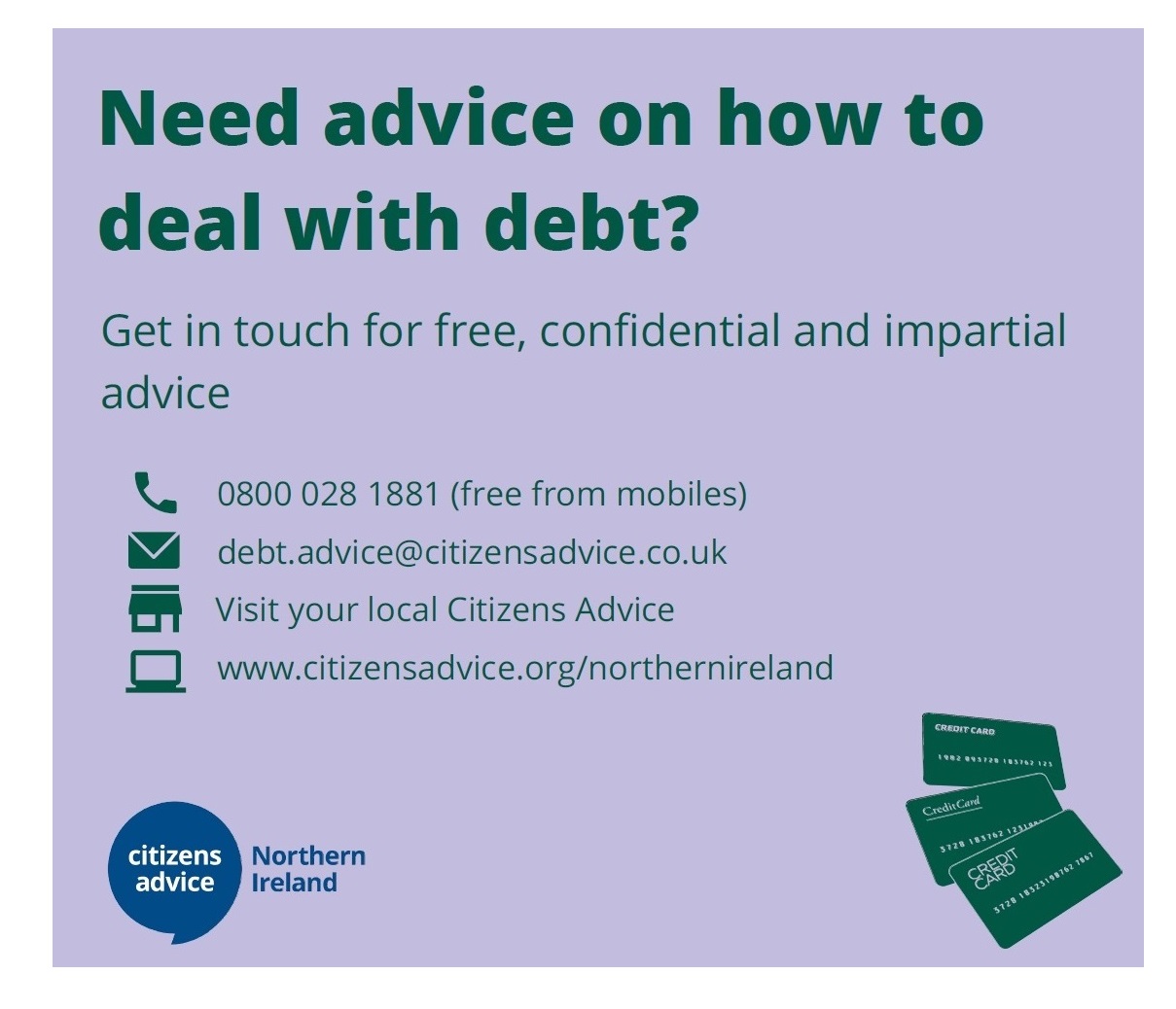 The Citizens Advice Northern Ireland and the Money Advice Service have launched a new Free Debt Advice Service for people across Northern Ireland who need help with their debt problems. The service is available via phone, email and face-to- face appointment across the 29 frontline Citizen Advice offices across the region.